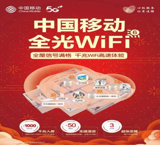 移动全光WiFi的优势、特点有哪些呢?作为革新传统宽带的智慧产品,移动全光WiFi,采用FTTR光纤替代网线,具有优千兆、广覆盖、易演进、稳漫游的特点,从此告别网线,光纤直达房间,网络无感知切换,全家信号绝绝子,全方位满足家庭高质量的网络需求。