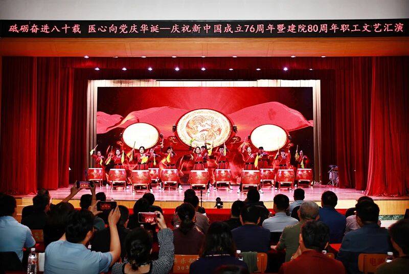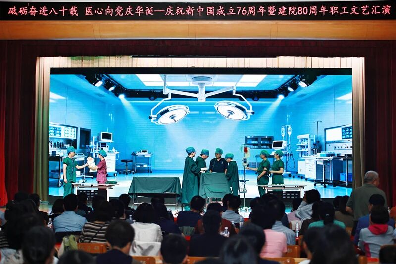 晚会在门诊分会带来的中国鼓《精忠报国》中震撼开场。药剂科工会小组的表演者们以激昂的鼓点和豪迈的气势,瞬间点燃了全场热情。整场晚会节目丰富多彩,高潮迭起,充分展现了医院文化的深厚底蕴和职工们的多才多艺。内科分会的歌曲《如愿》婉转动人,唱出了对前辈奉献的感恩与对美好未来的期许;由感染病院区与行政后勤分会带来的舞蹈《我和我的祖国》,以优美的舞姿深情演绎了与祖国血脉相连的情感;内科分会的快板《金秋颂院谱华章》以轻快的节奏,生动讲述了医院八十年来的发展成就,创意十足。由外科分会手术室创作演出的情景剧《生命之光之永不言弃》,演员们用真挚的表演,还原了手术室里争分夺秒、守护生命的紧张与感动,彰显了医务工作者敬佑生命、大爱无疆的职业精神。外科分会的诗朗诵《八秩长歌 仁心永铸》,声情并茂,道出了医院八十年风雨兼程中不变的初心与担当。门诊分会的小品《“声”情守护》则取材于日常工作,展现了医患之间的理解与温情。歌曲串烧《明天会更好》由外科分会老中青三代人接力献唱,唱出了医务工作者用青春和汗水,守护人民健康的坚守和执着。