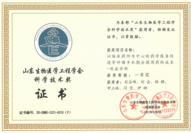 近日,2025年度山东生物医学工程学会科学技术奖获奖名单揭晓,济南市人民医院狄会峰、刘会团队的研究课题“以临床药师为中心的药学服务促进骨科围手术期合理用药的成本-效益分析”荣获一等奖。