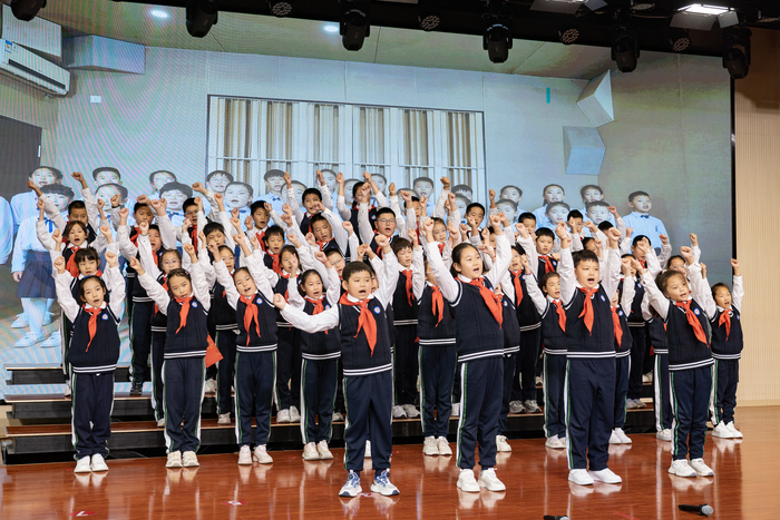 宣讲结束后,学生代表们身着整齐的服装,深情朗诵了诗歌《以青春之声致敬英雄》。孩子们用稚嫩而坚定的声音,表达了对革命先烈的崇敬之情和传承红色基因的决心,真挚的情感感染了现场每一位观众。活动最后,全体人员起立,共同唱响爱国歌曲《歌唱祖国》。激昂的旋律回荡在校园上空,凝聚起爱国奋进的磅礴力量,也为本次主题活动画上了圆满的句号。