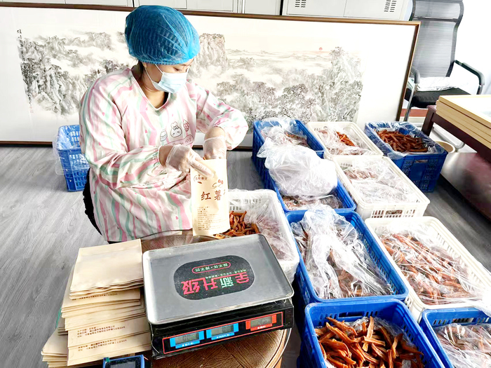在这条产业链上,“新农人”成为生力军。2022年,苗山镇青春党建联盟成立,乡村振兴工作专员创立的五彩苗山农业盘活闲置资产建设食品加工厂,借直播电商打通产销动脉……苗山蜜薯线上日销超万单。