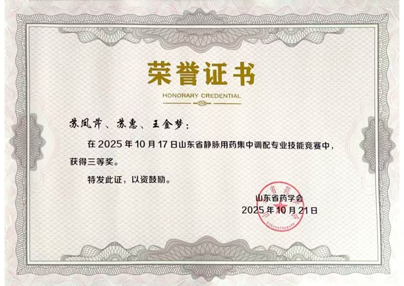 近日,山东省药学会静脉用药安全调配专业委员会在济南举办了“2025年山东省药学会静脉用药集中调配专业技能竞赛”。济南市人民医院静配中心苏惠、王金梦两位药师在苏凤芹老师的带领下参赛,在众多参赛团队中脱颖而出,荣获三等奖。
