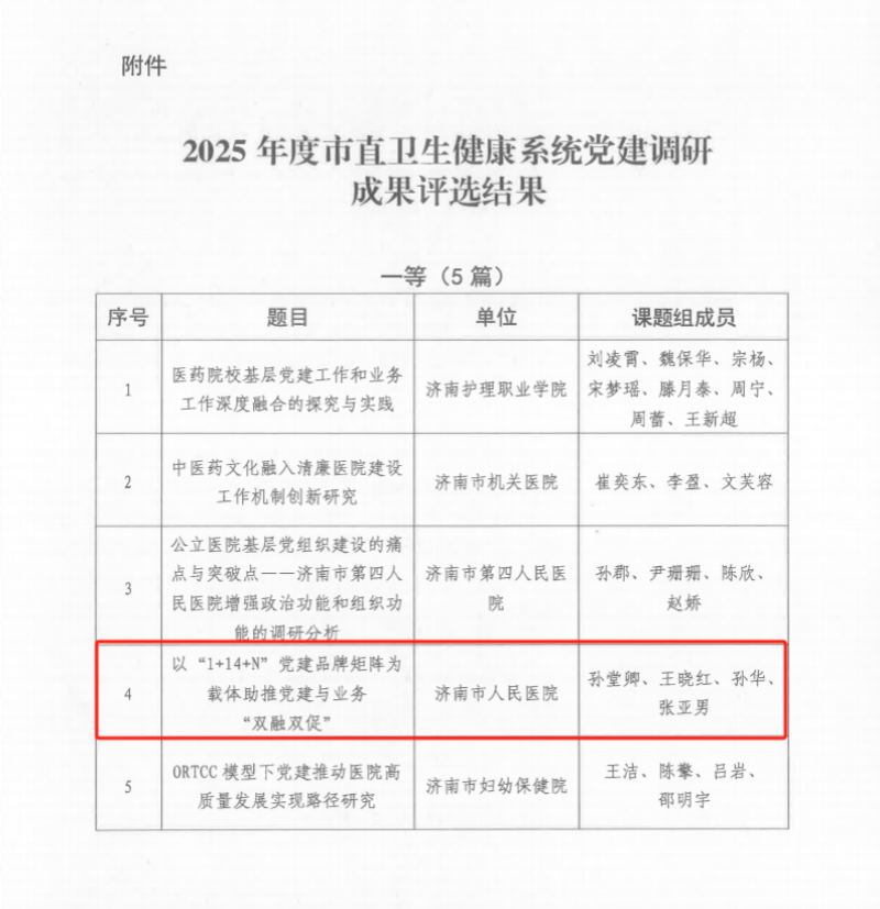 近日,济南市卫生健康思想政治工作促进会印发《关于开展2025年公立医院党建课题调研工作的通知》,对开展2025年全市公立医院党建课题调研工作作出部署。济南市人民医院党委积极响应,形成高质量调研报告《以“1+14+N”党建品牌矩阵为载体,助推党建与业务“双融双促”》,荣获2025年度市直卫生健康系统党建调研成果评选一等奖。