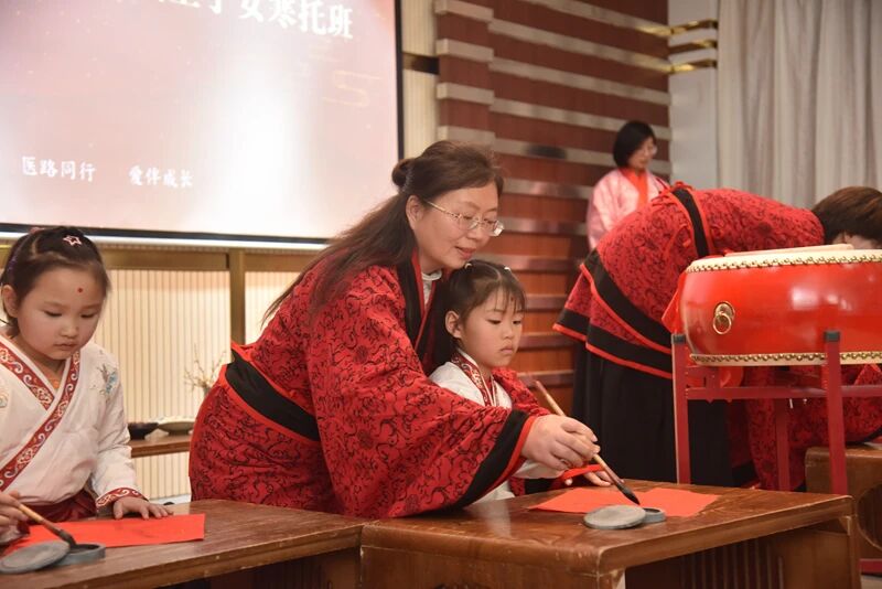 开班仪式特别设置了传统“开笔礼”环节,孩子们在老师指导下亲身体验这一传统文化仪式,感受崇德立志的礼仪教育。家长代表、医院影像科周涛医生在发言中表达了对托管班的信任与期待:“这样的安排既解决了我们的后顾之忧,又让孩子在传统文化熏陶中度过一个有意义的寒假,让我们一线医护职工能够更专注地服务患者。”
